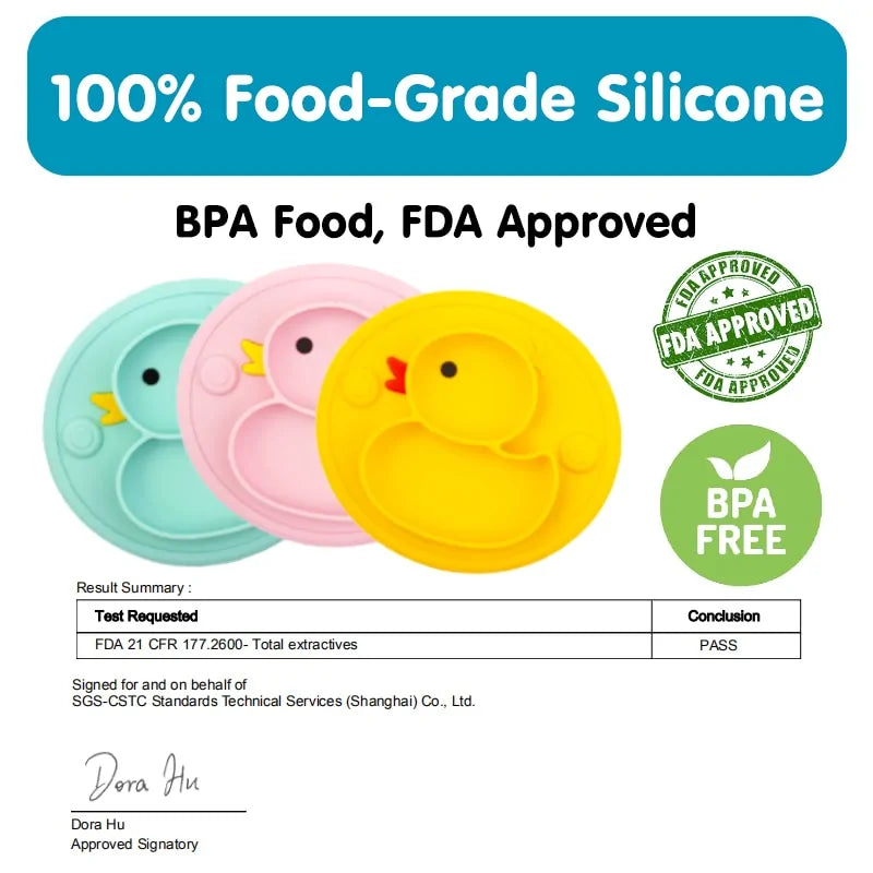 Ensure safe and enjoyable meals with our baby duck shape silicone plate. Its adorable design and sturdy silicone material make it perfect for little hands, providing a secure base that prevents tipping and spills during feeding.